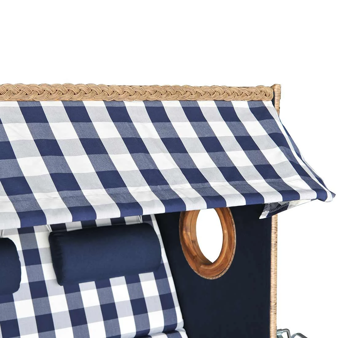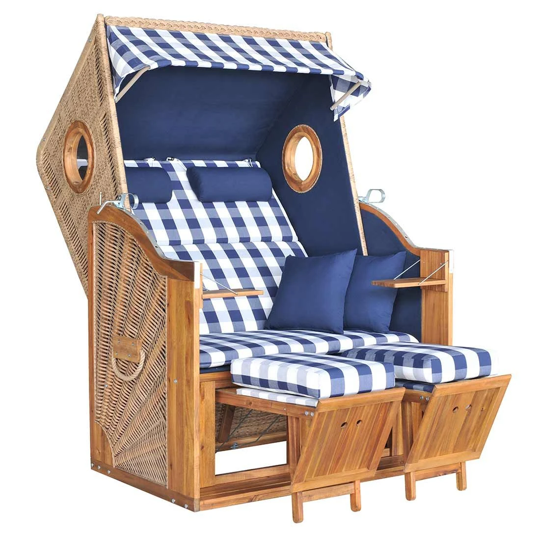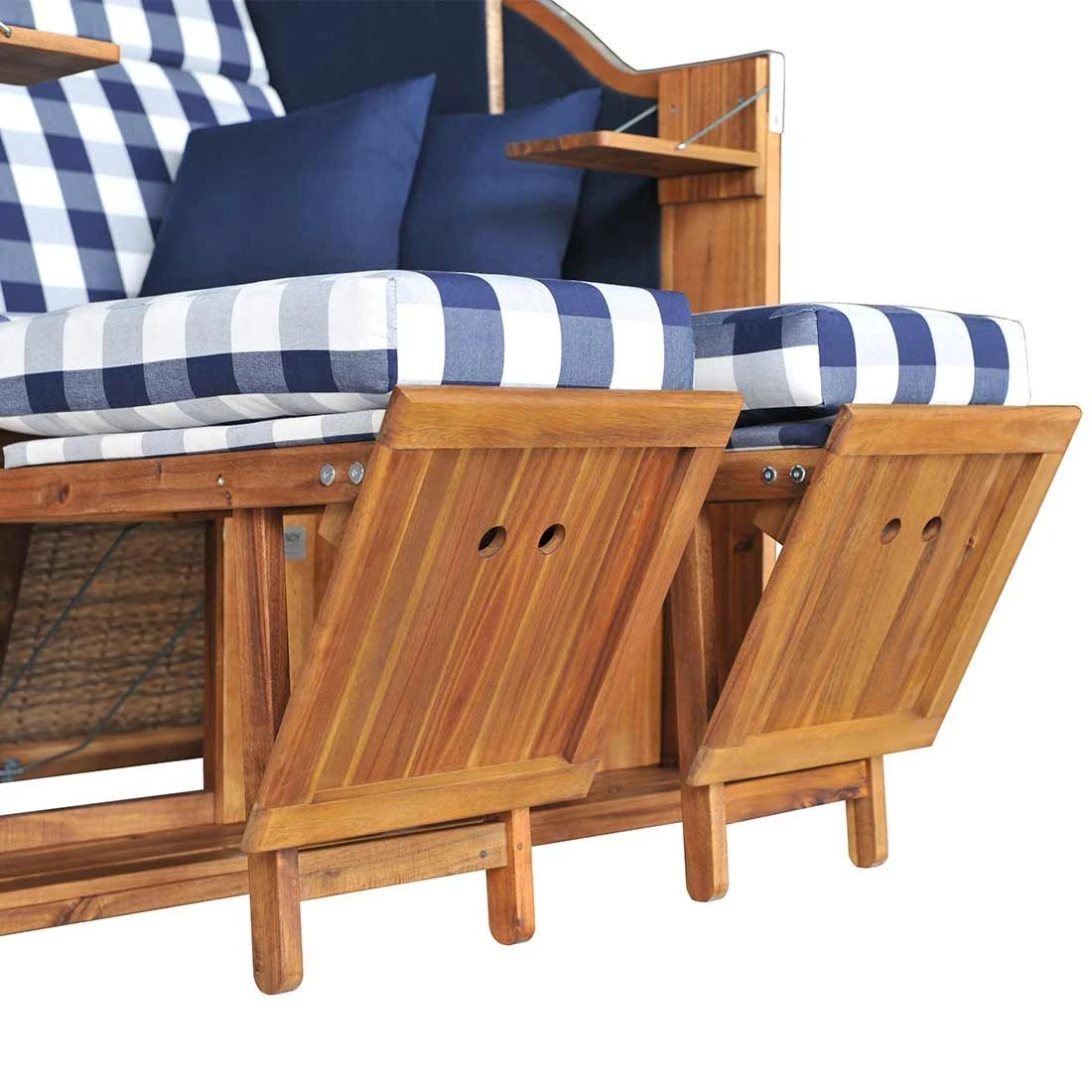 Der Strandkorb selbst besteht aus Massivholz sowie Akazienholz. Beides harmoniert hervorragend miteinander. Das Grundgerüst des Strandkorbs ist in Walnuss gehalten. Äußerlich überzeugt der Strandkorb Trend mit seinem Akazienholz im Farbton Walnuss. Als weiterer Hingucker und komfortables Highlight fungiert die Sitzfläche (Blau). In Verbindung mit den anderen Bestandteilen des Strandkorbs ergibt sich ein attraktives Gesamtbild.