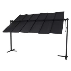 Der Bezug des Schirms besteht aus witterungsbeständigem Polyestergewebe mit einem Gewicht von 180g/m². Das Polyester ist wasserabweisend und besitzt einen UV-Schutzfaktor von 50+. Der Bezug kann zur leichteren Reinigung (Handwäsche) abgenommen werden.