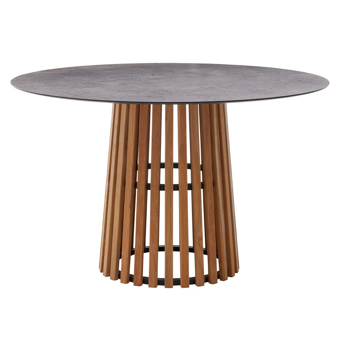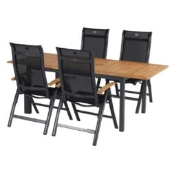 Für ein natürliches Gesamtbild sorgen die Gestelle aus robustem Teakholz. Optisch ansprechend ist die Farbgebung der Gestelle in Natur. Zum Lieferumfang des Sets gehört auch ein praktischer Tisch. Dessen massive Tischplatte aus leicht zu pflegendem HPL-Kunststoffverbund ist im Besonderen für Veranstaltungen im Freien und das Essen draußen außerordentlich gut geeignet. Der Tisch ist in klassisch rund gestaltet. Ein stabiler Unterbau und dabei gleichzeitig dekorativ ist das Säulengestell. Während die Farbe des Gestells Natur ist, begeistert die Tischplatte in Beton.