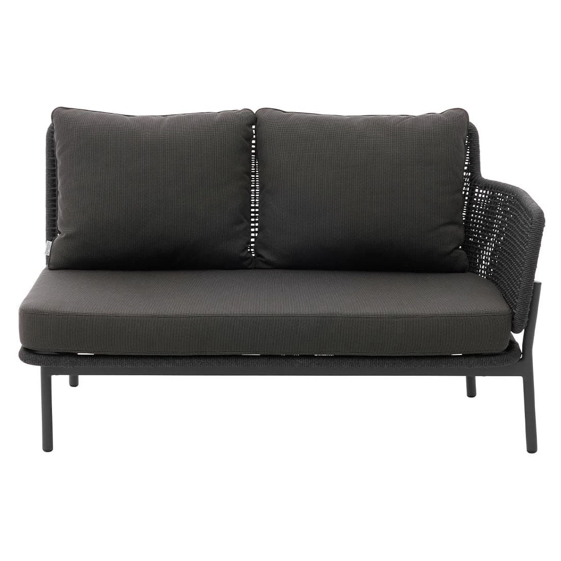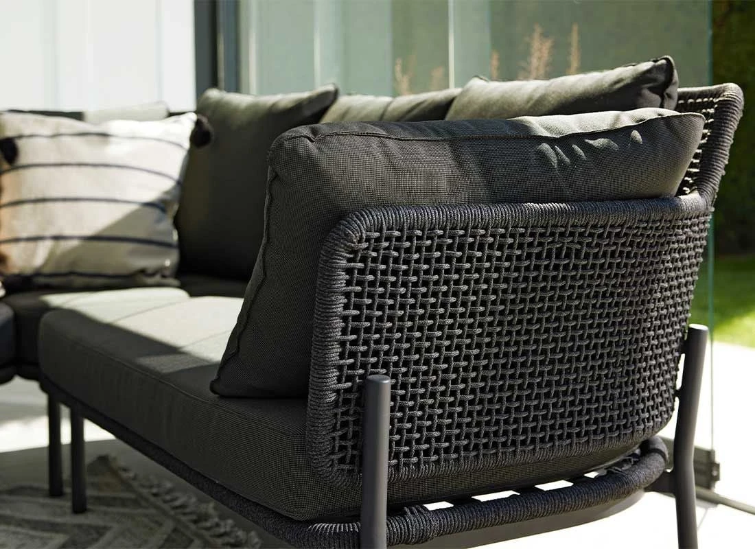 Für den Korpus und die Sitzfläche kommt Rope zum Einsatz. Damit das Eck-/Endmodul optisch ansprechend ist, sind der Korpus und die Sitzfläche im Farbton Grau gehalten. Das Gestell ist aus Aluminium hergestellt. Optisch begeistert das Gestell in der Farbe Anthrazit. Die Bezüge sind aus dem Marken-Outdoorstoff Olefin gefertigt. Das Material verbindet eine angenehme Stoffoberfläche mit hoher Witterungsbeständigkeit. Denn sowohl Sonne als auch Regen können dem robusten Outdoor-Stoff kaum etwas anhaben. Die Farbe des Bezugs ist Dunkelgrau.