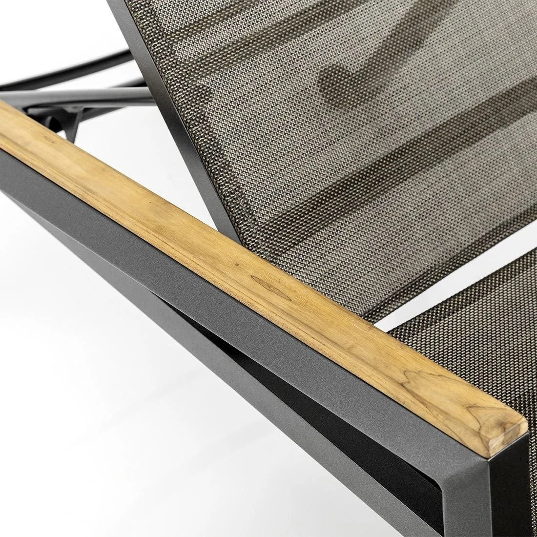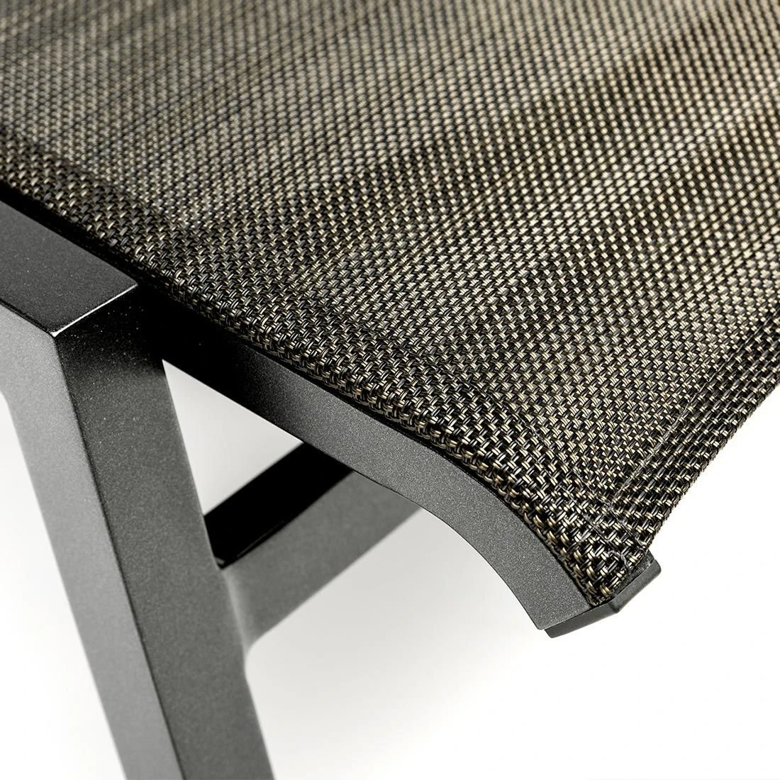 Für die Herstellung des Gestells wird hochwertiges und wetterfestes Aluminium verwendet. Für eine attraktive Optik ist das Gestell im Farbton Anthrazit gehalten. Für die Bespannung der Sitzfläche wird hochwertiges Textilene verwendet. Es zeichnet sich durch eine hohe Robustheit gegenüber Hitze und Frost aus und ist leicht zu reinigen. Die Sitzfläche hat eine elegante Farbgebung in Bronze.