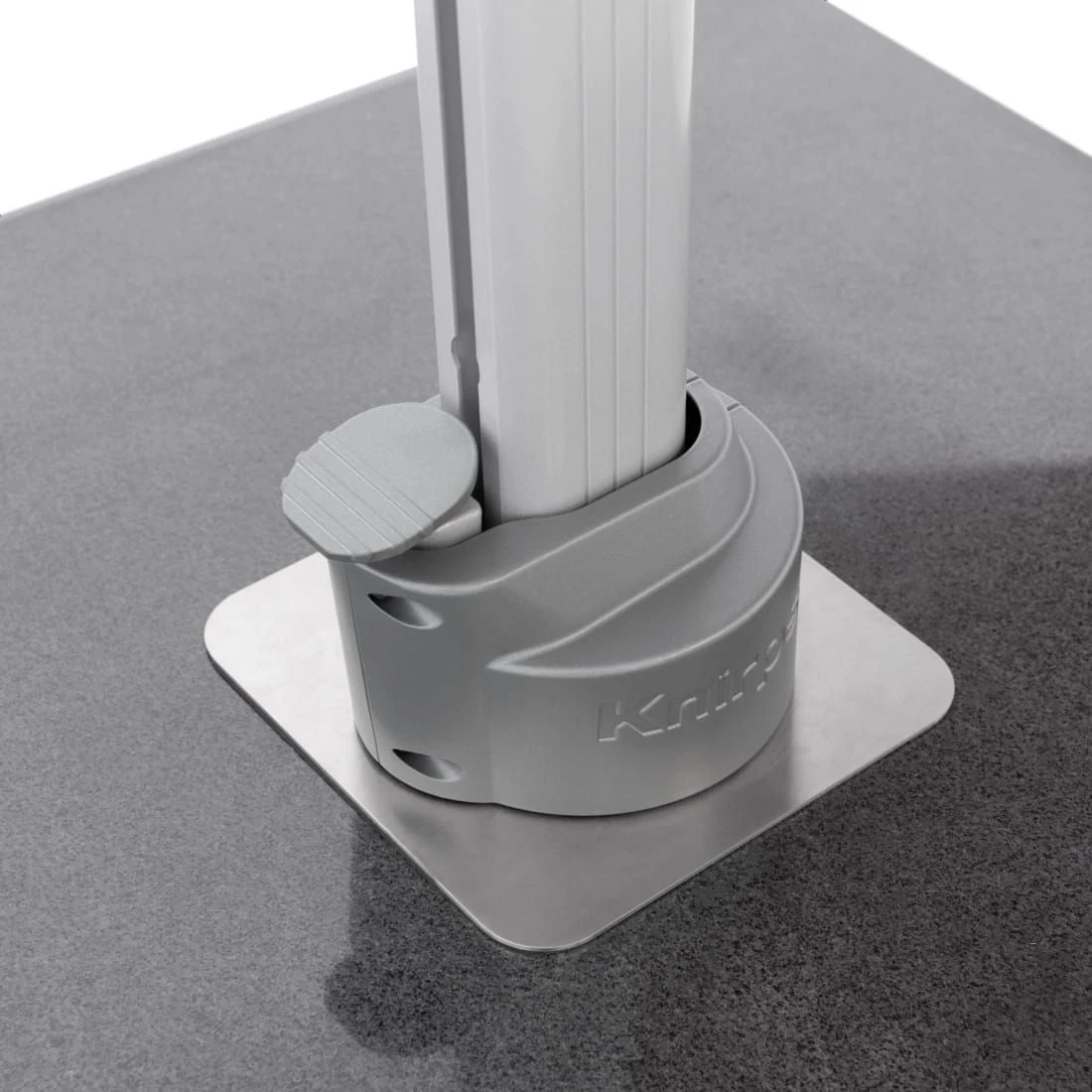 Aufgrund der durchdachten Konstruktion geht bei dem Ampelschirm nichts von der beschatteten Fläche verloren. Was Mitte der 1920er Jahre mit dem weltweit ersten kompakten Taschenregenschirm Knirps begann, ist heute zu einer innovativen Marke herangewachsen, die auch im Segment der Sonnenschirme für Qualtät und durchdachte Funktionalität steht. Der Durchmesser des Schirmstocks beträgt 50mm x 80 mm. Das quadratische Schirmdach des Sonnenschirms hat die Maße 275 cm x 275 cm. Strapazierfähiges Polyester wurde für die Bespannung des Schirmdachs gewählt. Gefertigt ist der Mast des Schirms aus Aluminium. Der Schirmmast ist in einem schlichten Grauton gehalten. Der Sonnenschirm hat eine Durchgangshöhe von ca. 205 cm. Aufspannen lässt sich der Sonnenschirm ganz einfach durch die Betätigung der Kurbel. Das Schirmdach lässt sich bei diesem Sonnenschirm aufstellen und kippen. Der Ampelschirm ist mittels Fußpedal drehbar und lässt sich somit je nach Sonnenstand bequem neu ausrichten.