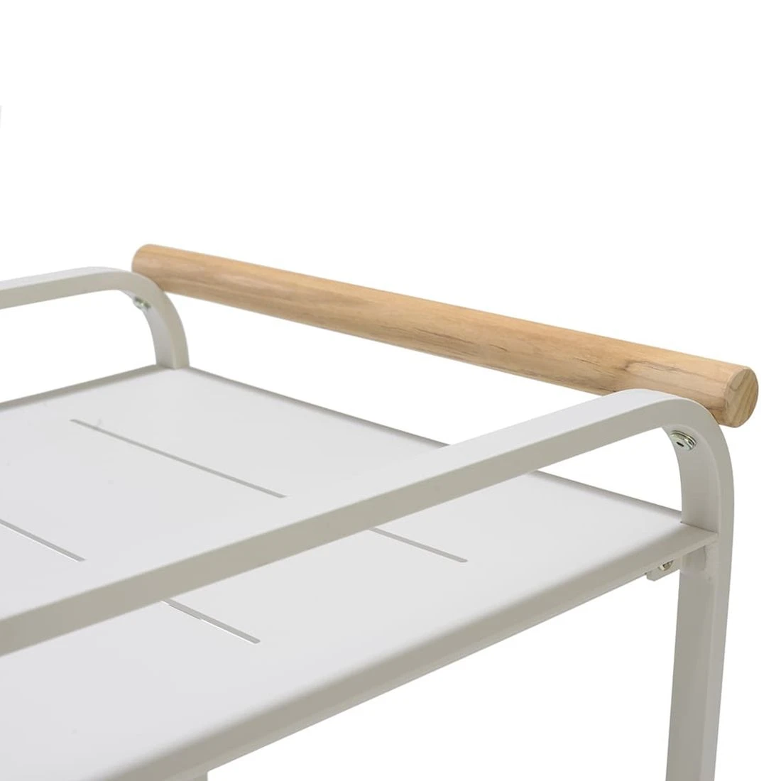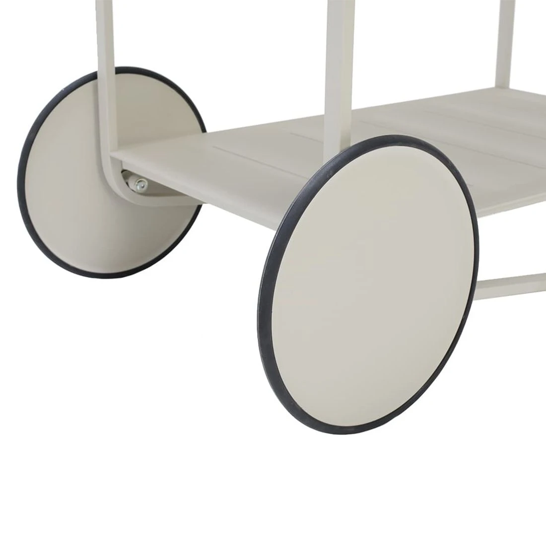 Gefertigt ist der Servierwagen aus witterungsbeständigem Aluminium. Darüber hinaus verfügt er über einen angenehmen Teakholz-Griff, mit dem Sie den Wagen bequem schieben können. Dafür sorgen auch die beiden großen Rollen. Im Reiter „Eigenschaften“ finden Sie detaillierte Angaben zu Materialien und Maßen.