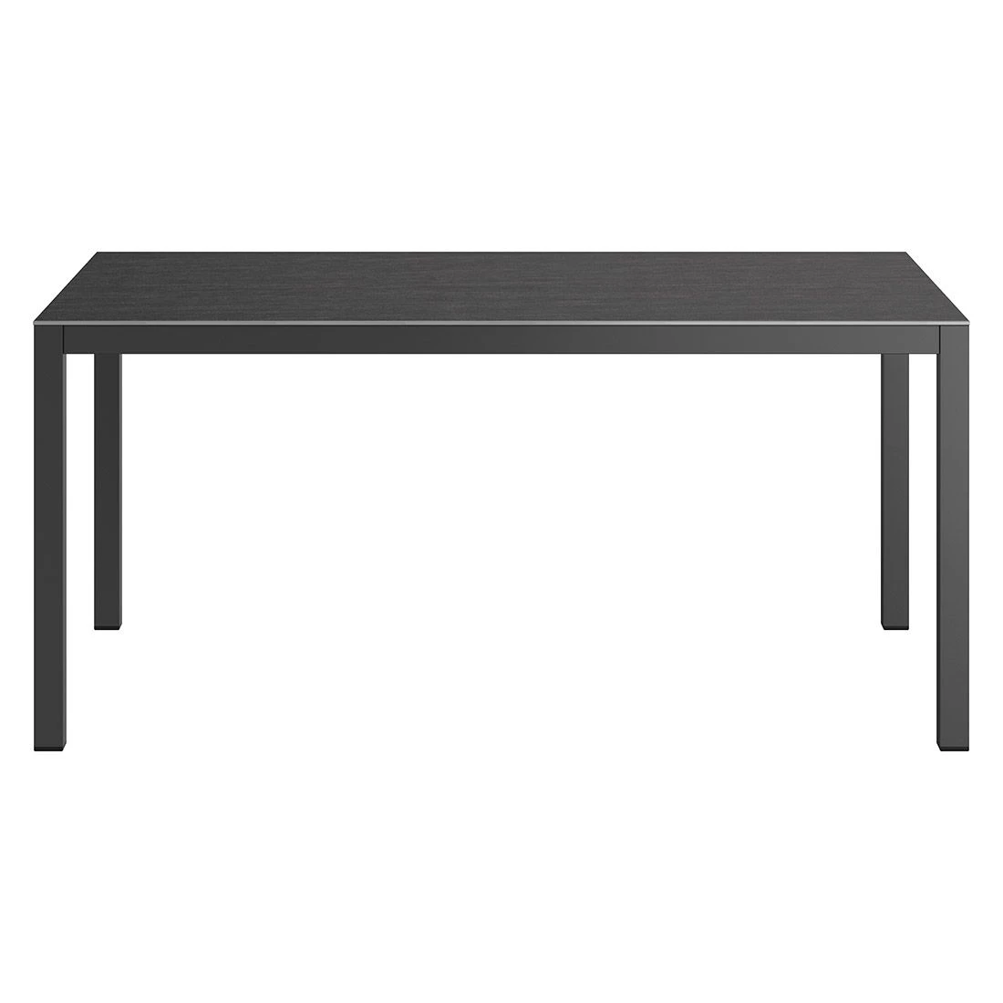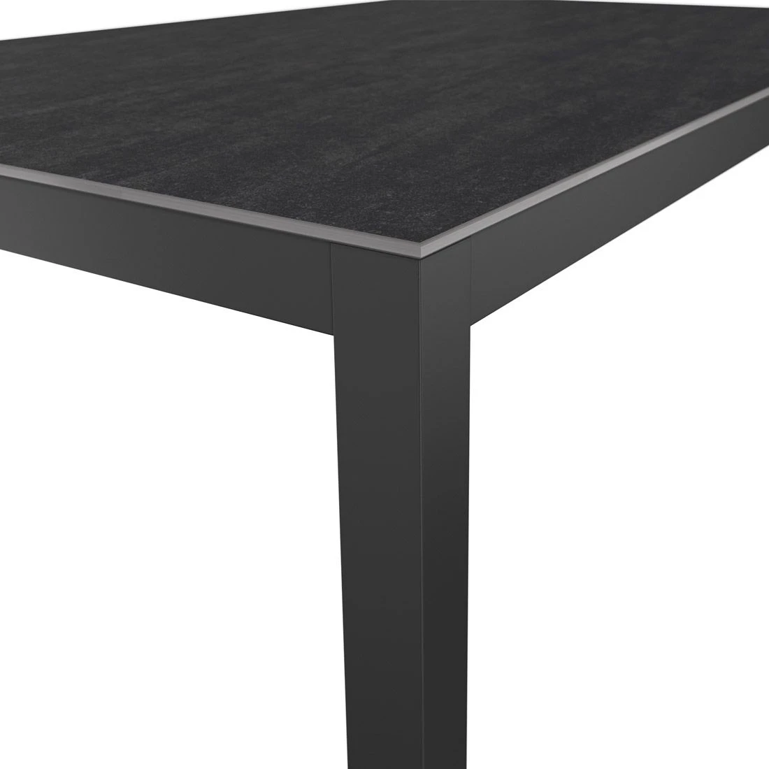 Das Gestell des eleganten Tisches besteht aus Aluminium. Optisch ist das Gestell in Anthrazit gehalten. Die Tischplatte besteht aus Dekton, weshalb Sie den Gartentisch optimal im Garten oder auf der Terrasse verwenden können. Für ein stimmiges Gesamtbild erscheint die Platte in der Farbe Bromo. Klassisch aus vier Tischbeinen besteht das Gestell des Tisches. Die rechteckige Form ermöglicht es Ihnen, den Gartentisch in Ecken und an Häuserwänden platzsparend einzusetzen.