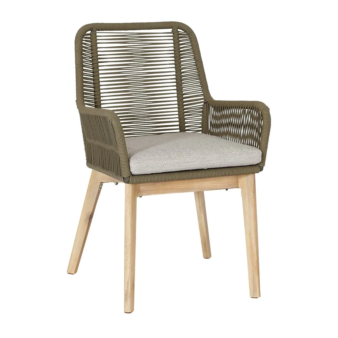 Der Korpus und die Sitzfläche sind aus Rope gefertigt. Das Gestell wird aus Akazienholz gefertigt. Die hohe Dichte und die gute Wetterfestigkeit des Materials machen das Gestell besonders robust. Für eine attraktive Optik ist das Gestell im Farbton Natur gehalten. Als hochwertiges Material für den Bezug kommt ein Polyester-Stoff zum Einsatz. Er ist sehr strapazierfähig und bietet somit die idealen Voraussetzungen für den Einsatz im Freien. Farblich begeistert der Bezug in elegantem Sand. Damit der Gartensessel optisch ansprechend ist, sind der Korpus und die Sitzfläche im Farbton Olivgrün gehalten.