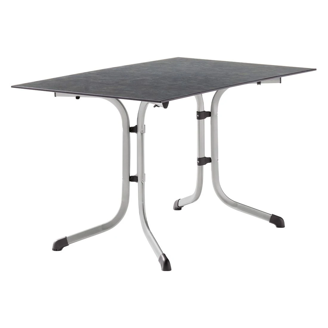 Als stabiler Unterbau für die Tischplatte dient ein Gestell aus hochwertigem Stahl. Farblich ist das Gestell in Graphit gehalten. Die robuste Tischplatte aus Polytec überzeugt mit ihren Materialeigenschaften. Die Platte ist wetter-, kälte- und kratzfest und damit der perfekte Begleiter für Ihren Outdoor-Bereich. Für ein stimmiges Gesamtbild erscheint die Platte in der Farbe Schiefer. Die rechteckige Form ermöglicht es Ihnen, den Klapptisch in Ecken und an Häuserwänden platzsparend einzusetzen.