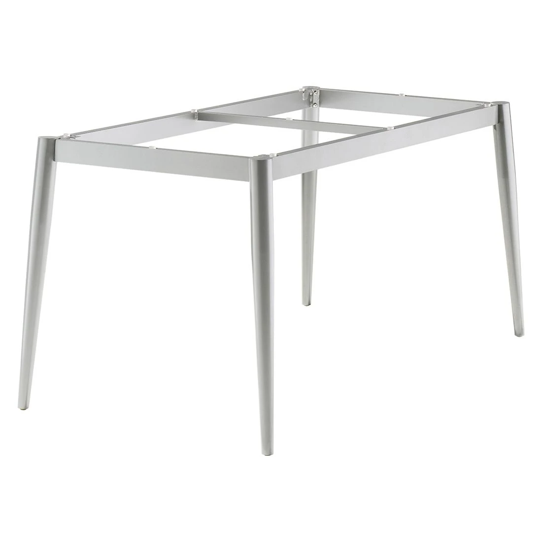 Das Gestell des eleganten Tisches ist aus Aluminium gefertigt. Als klassische Design-Komponente fungiert das geradlinige Vierfußgestell. Die rechteckige Form ermöglicht es Ihnen, das Tischgestell in Ecken und an Häuserwänden platzsparend einzusetzen.