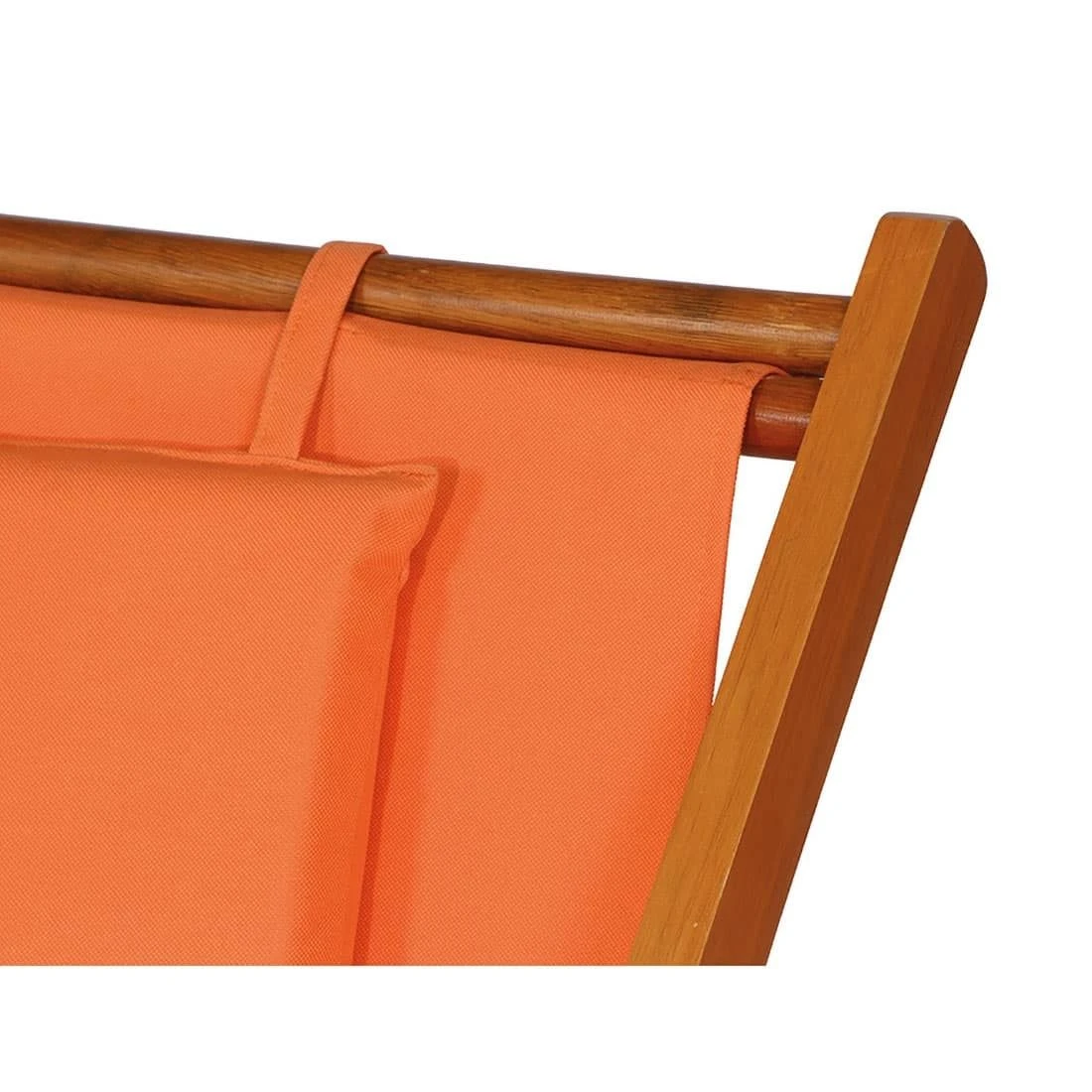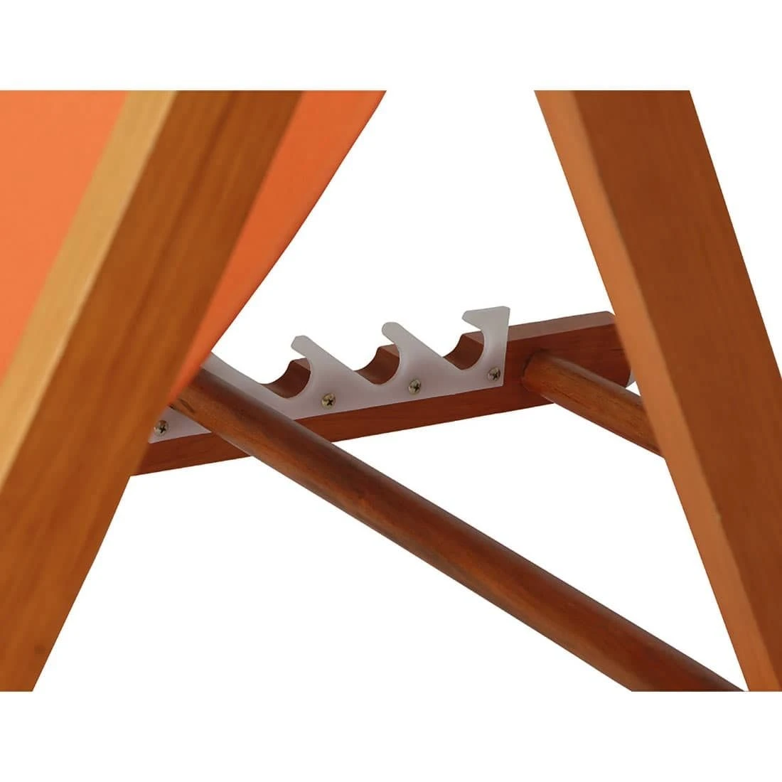 Das Gestell ist aus langlebigem Holz gefertigt und sorgt damit für einen stabilen Halt. Farblich ist dieses in Braun gehalten. Die Sitzfläche des Liegestuhls wird mit Polyester bespannt. Die Sitzfläche ist in ansprechendem Orange gehalten.