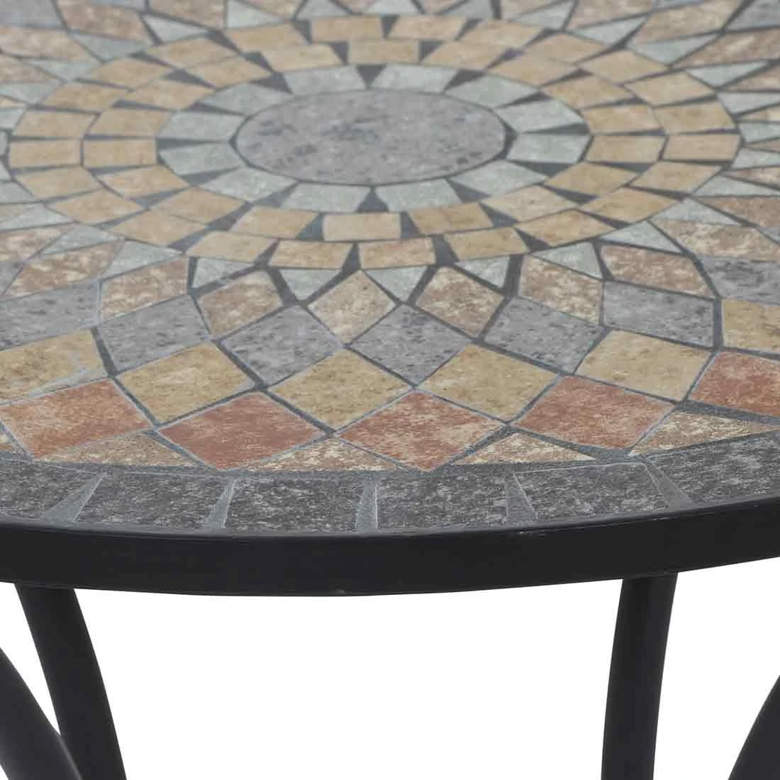 Als stabiler Unterbau für die Tischplatte dient ein Gestell aus hochwertigem Eisen. Optisch ist das Gestell in Schwarz gehalten. Als Material für die Tischplatte wird Kunststein verwendet, weshalb Sie den Gartentisch optimal im Garten oder auf der Terrasse verwenden können. Für ein stimmiges Gesamtbild erscheint die Platte in der Farbe Mosaik. Das klassische Vierfuß-Gestell garantiert Ihnen maximale Beinfreiheit. Die Form des Gartentisches ist rund.