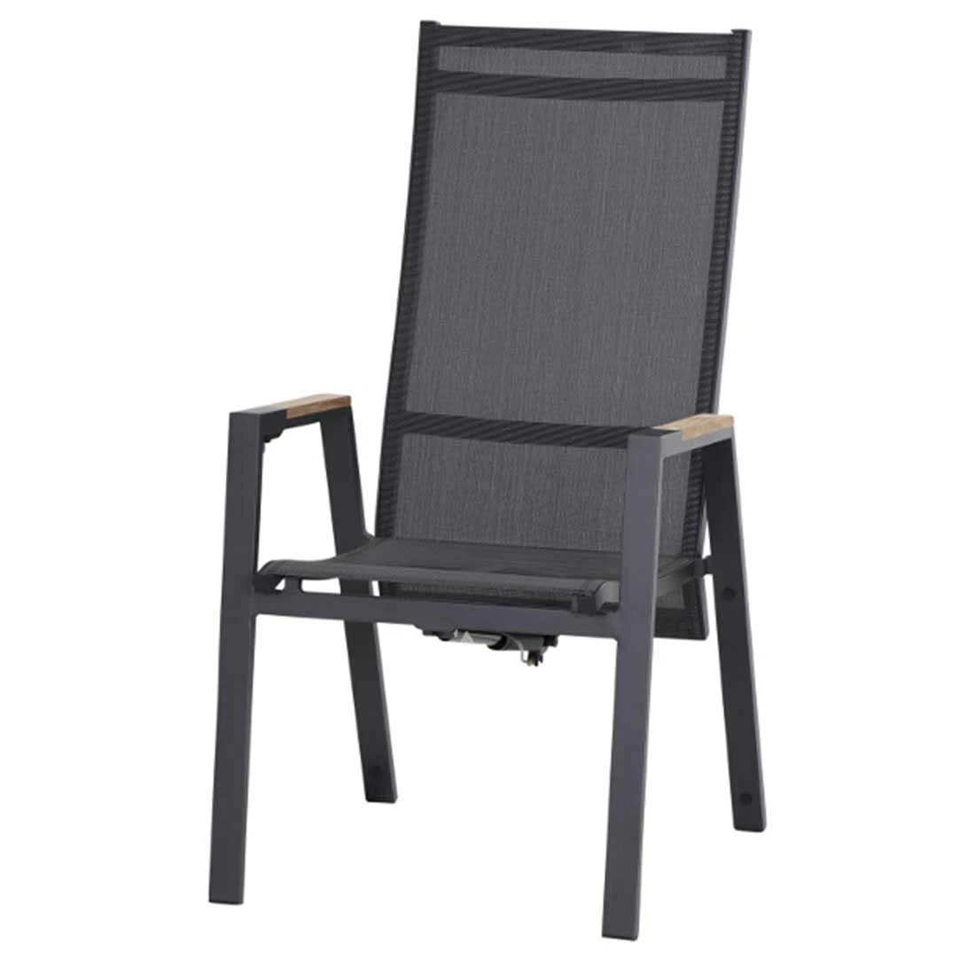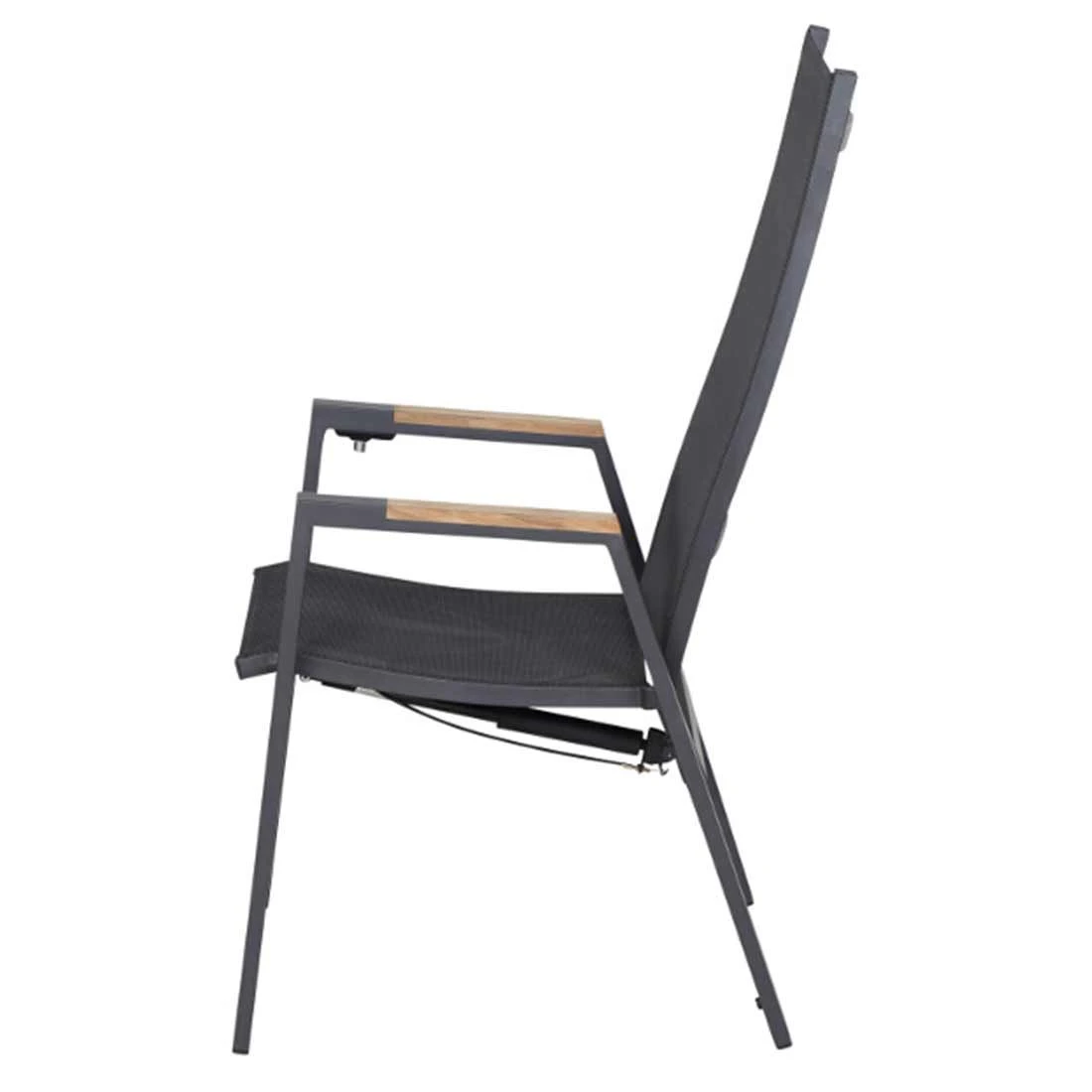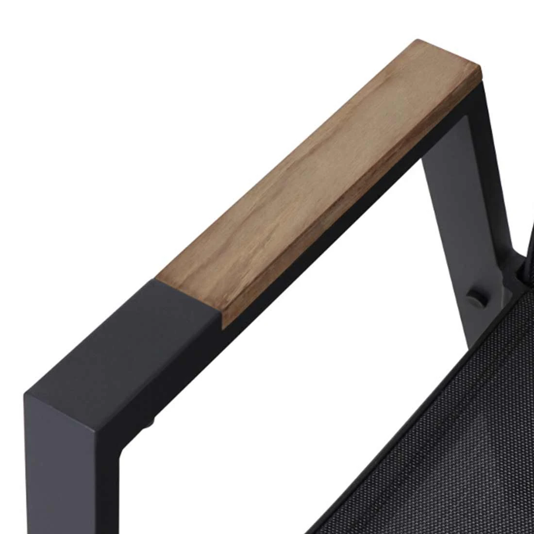 Das Gestell besteht aus pflegeleichtem und wetterfestem Aluminium. Für eine attraktive Optik ist das Gestell im Farbton Anthrazit gehalten. Für die Bespannung der Sitzfläche verlässt sich der Hersteller auf hochwertiges Textilene. Es zeichnet sich durch eine hohe Robustheit gegenüber Hitze und Frost aus und ist leicht zu reinigen. Die Sitzfläche hat eine attraktive Farbgebung in Schwarz-Silber.