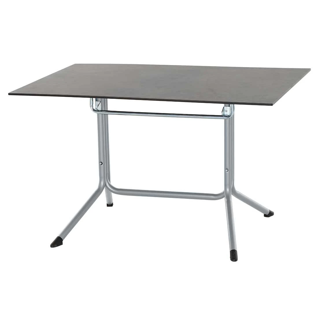 Seine Stabilität erhält der Tisch durch das robuste Tischgestell aus Stahl. Eine wunderschöne Optik bietet Ihnen die Tischplatte aus HPL-Kunststoffverbund. Diese natürlich gehaltene Tischplatte ist zusätzlich frostsicher und hitzebeständig bis zu 180 °C. Für ein stimmiges Gesamtbild erscheint die Platte in der Farbe Dark Stone.