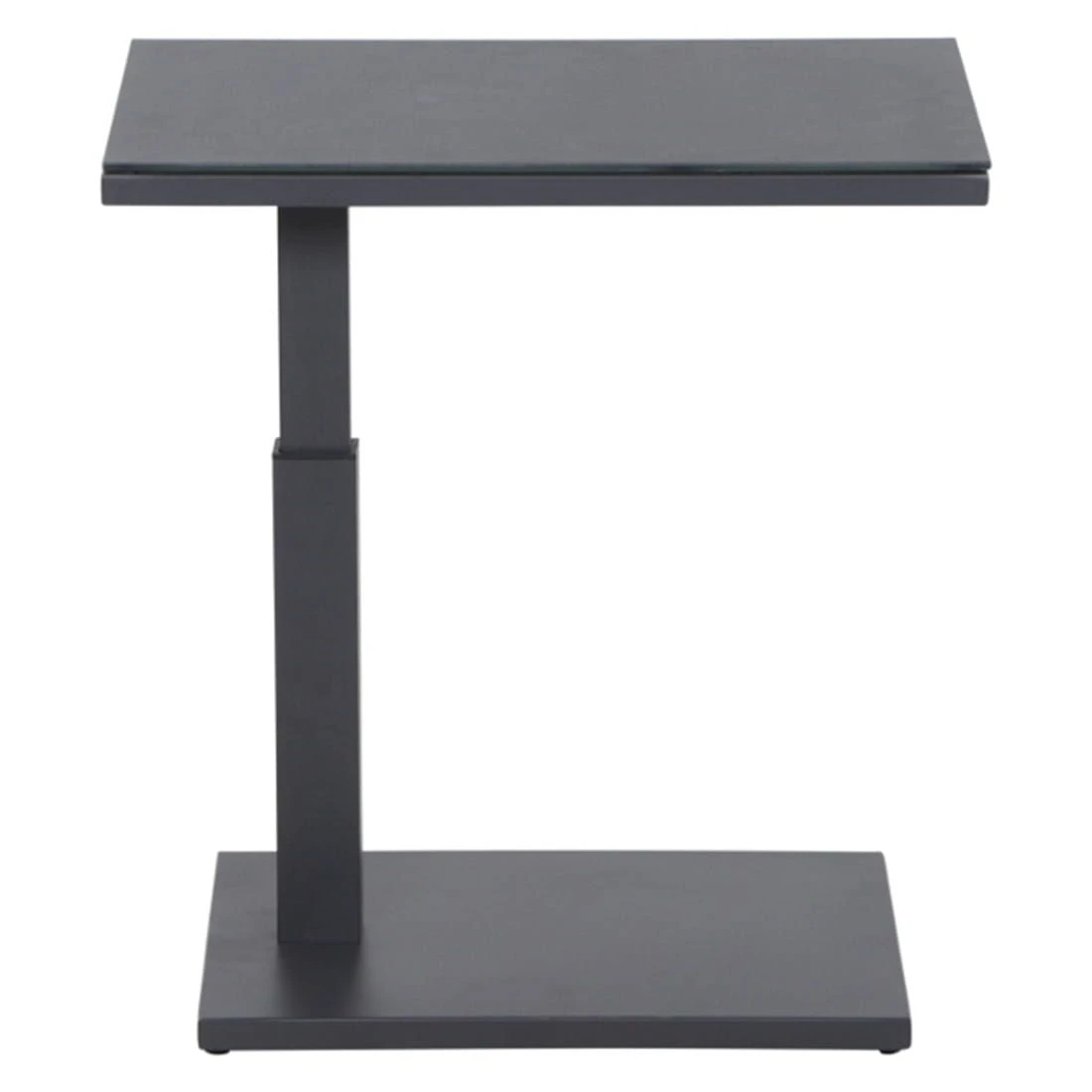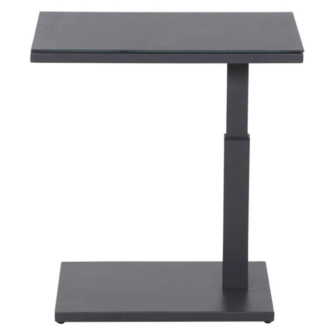 Das Gestell des eleganten Tisches besteht aus Aluminium. Optisch ist das Gestell in Anthrazit gehalten. Für die Herstellung der Tischplatte wird robustes Glas verwendet. Farblich ist die Tischplatte in einem schönen Dunkelgrau gehalten. Das Design des Beistelltischs ist klassisch rechteckig gehalten.