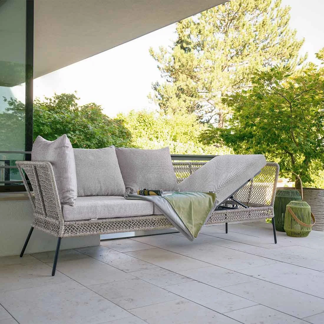 Für die Herstellung des Gestells wird hochwertiges und wetterfestes Aluminium verwendet. Farblich ist dieses in Schwarz Matt gehalten. Hochwertiges Rope umgibt das robuste Gestell und verleiht der Loungebank damit einen ganz besonderen Look.