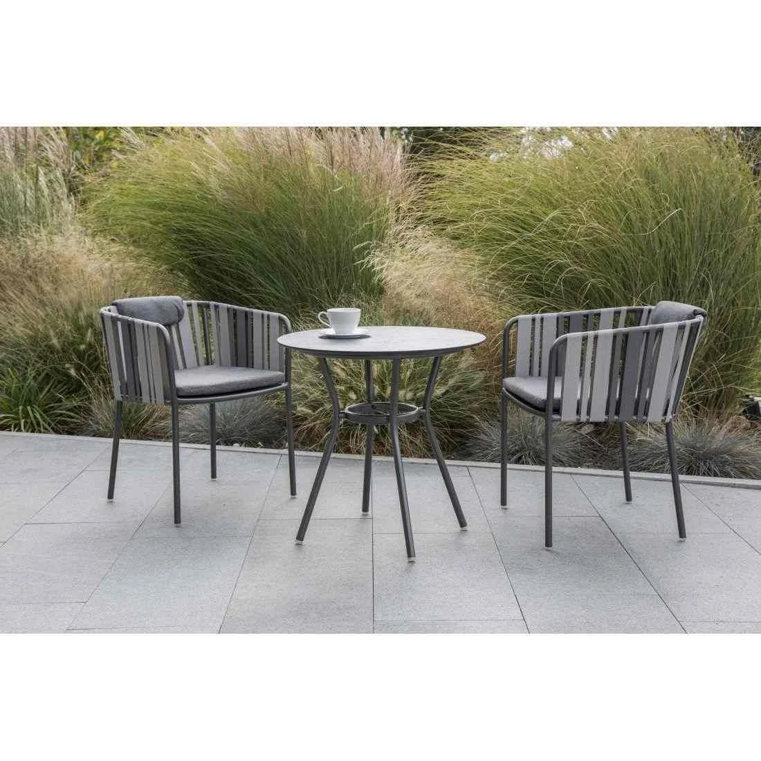 Als Gestellmaterial dient hochwertiges und leichtes Aluminium. Klassisch aus vier Tischbeinen besteht das Gestell des Tisches. Für die Tischplatte verwendet Stern Silverstar. Dieses Material wird aus bis zu 50 Lagen Papierlaminatschichten gefertigt, die unter großer Hitze und hohem Druck verpresst werden. Diese Technik verleiht der Tischplatte ganz besondere Eigenschaften, denn sie ist kratzfest, kälte- (-20 °C) und hitzebeständig (180 °C), UV-beständig, pflegeleicht und abriebfest. Unabhängig von der Vielzahl an Dekoren ist der Kern immer schwarz, was man an der Kante der Platte erkennen kann. Farblich ist die Tischplatte in einem schönen Vintage Grau gehalten. Die Form des Gartentisches ist rund.