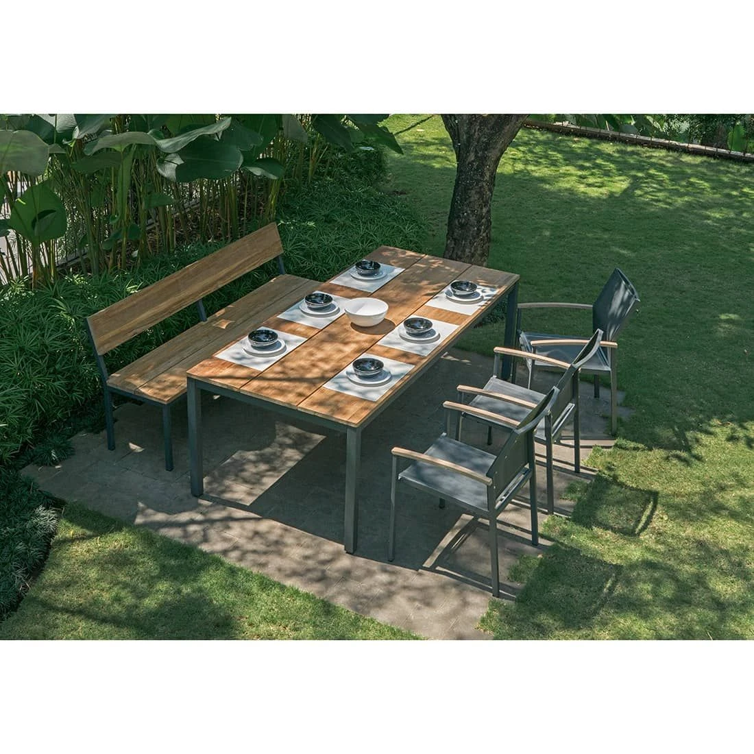 Das Gestell besteht aus pflegeleichtem und wetterfestem Aluminium. Für eine attraktive Optik ist das Gestell im Farbton Graphit gehalten. Fans natürlicher Materialien werden große Freude an der Sitzfläche aus recyceltem Teak haben. Die Farbgestaltung der Sitzfläche in Teak ist überaus ansprechend.